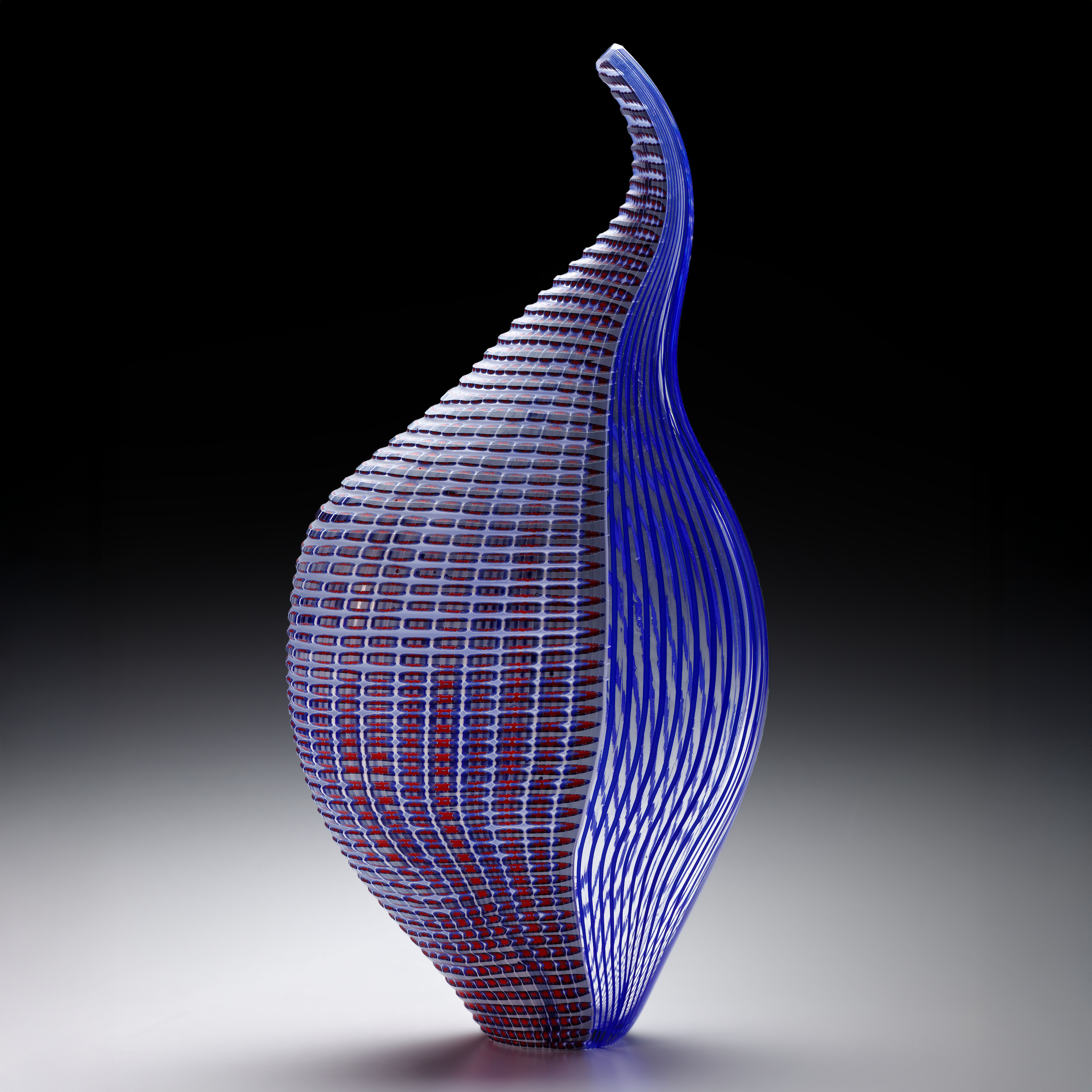 Ausgelegte und miteinander verschmolzene Glasstäbe aus blauem und farblosem Glas (A cane) bzw. aus dünnen, gebündelten und miteinander verschmolzenen Farbglasfäden (Zanfirico), mit der Pfeife aufgenommen und frei geformt, zum Teil geschliffene Bänder quer zu den Stäben